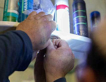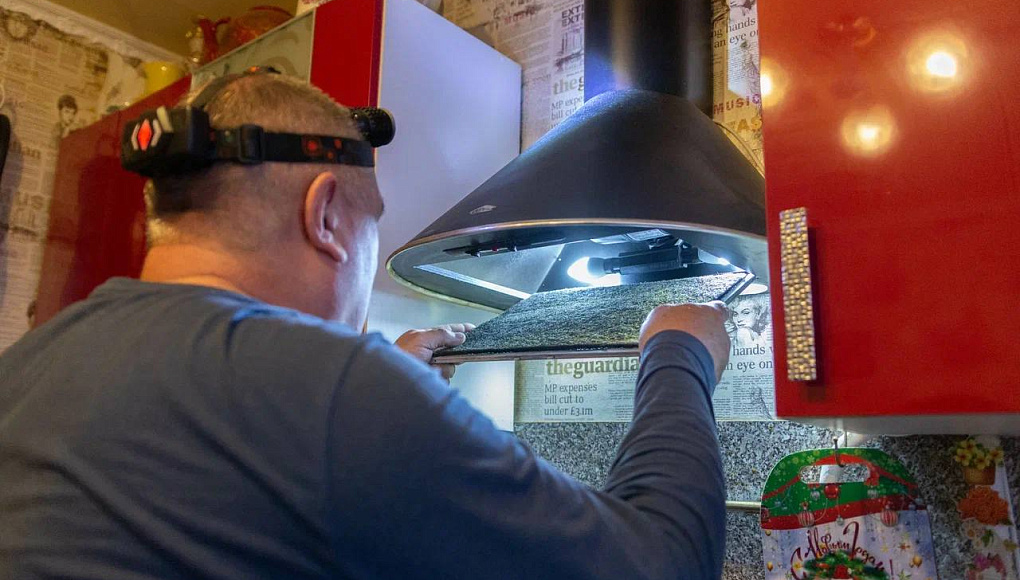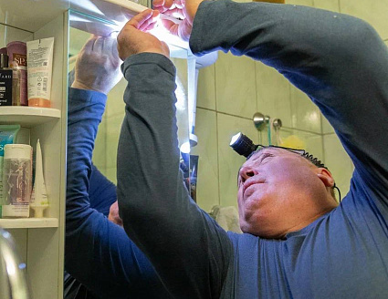 Мужчина заменил лампочку в ванной, в зеркальном шкафчике, а также в вытяжке на кухне.